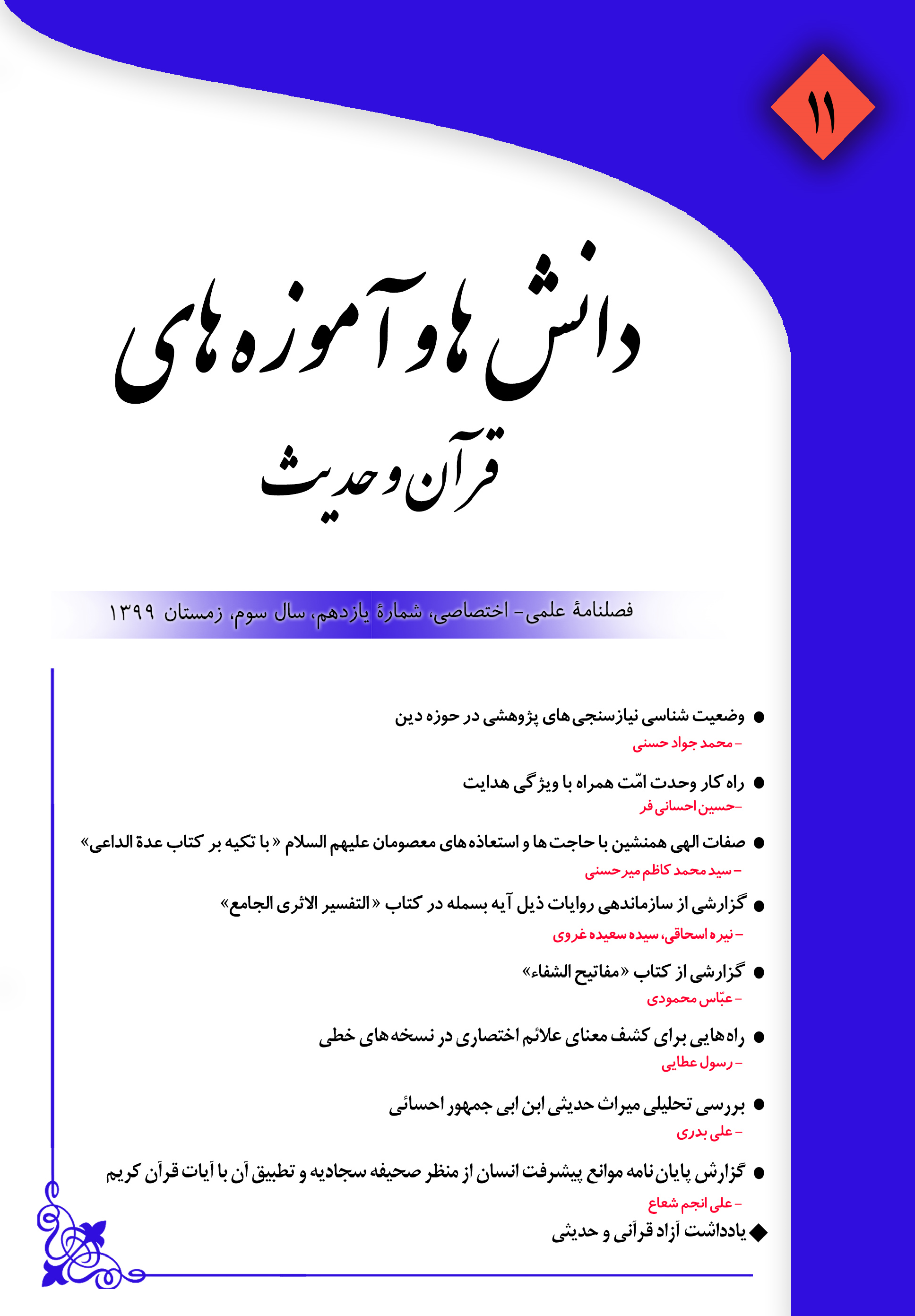 فهرست مقالات دسترسی آزاد مقاله صفحه چکیده متن کامل 1 - وضعیتشناسی نیازسنجیهای پژوهشی در حوزه دین محمد جواد حسنی دسترسی آزاد مقاله صفحه چکیده متن کامل 2 - راهکار وحدت امّت همراه با ویژگی هدایت، در نگاه قرآن و سنّت حسین احسانی فر دسترسی آزاد مقاله صفحه چکیده متن کامل 3 - صفات الهی همنشین با حاجتها و استعاذههای معصومان علیهم السلام (با تکیه بر کتاب عدّةالدّاعی) سید محمدکاظم میرحسنی دسترسی آزاد مقاله صفحه چکیده متن کامل 4 - گزارشی از سازماندهی روایات ذیل آیه بسمله در کتاب «التّفسیر الاثری الجامع» نیره اسحاقی سیده سعیده غروی دسترسی آزاد مقاله صفحه چکیده متن کامل 5 - گزارشی از کتاب «مفاتیح الشّفاء» عباس محمودی دسترسی آزاد مقاله صفحه چکیده متن کامل 6 - راههایی برای کشف معنای علائم اختصاری در نسخه های خطّی رسول عطایی دسترسی آزاد مقاله صفحه چکیده متن کامل 7 - بررسی تحلیلی میراث حدیثی ابن ابیجمهور اَحسائی سید حسن موسوی بروجردی علي بدري دسترسی آزاد مقاله صفحه چکیده متن کامل 8 - گزارشی از پایاننامه موانع پیشرفت انسان از منظر صحیفه سجّادیه و تطبیق آن با آیات قرآن کریم علی انجم شعاع دسترسی آزاد مقاله صفحه چکیده متن کامل 9 - نقش شرط و جزاء در خوانش جملههای درهمتنیده با تطبیق بر حدیث «لَو اَنَّ العِبادَ اِذا جَهِلوا وَقَفوا وَ لَم یَجحَدوا لَم یَکفُروا» حسین محققیان علی نقی پارسانیا